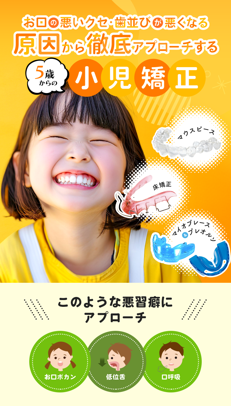 子どもの頃に行う小児矯正は顎の骨の成長を利用して治療を進めるため、抜歯リスクが少ない、心身の負担が減るなど、多くのメリットが存在します。また、矯正治療は歯並びを整えるだけでなく、噛み合わせや口周りの癖の改善、口呼吸や発音障害の予防にも効果があります。お子様の歯並びが気になる方はぜひ一度ご相談ください。