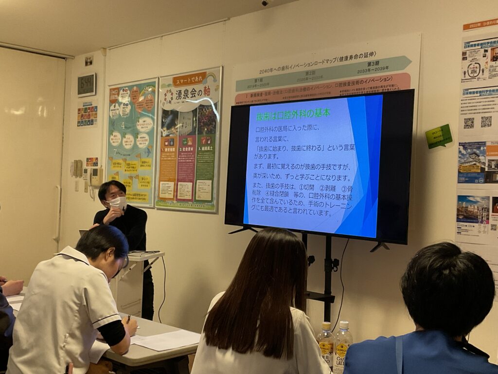 先日マツダ病院歯科口腔外科の坂本哲彦先生をお迎えして当院勤務医、研修医に向けて抜歯治療の講演会をしていただきました。